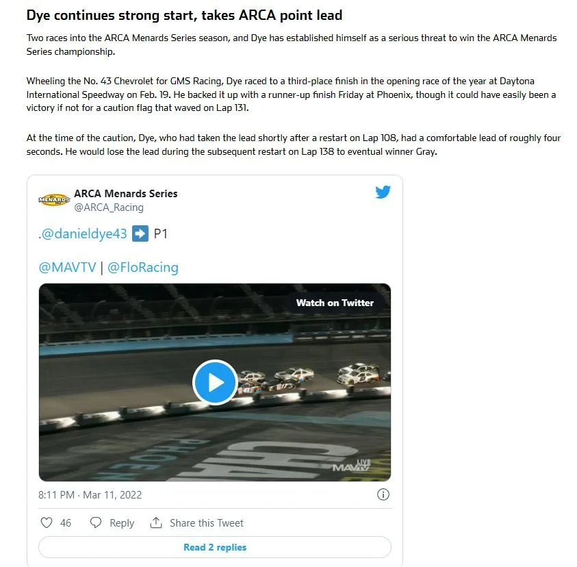 He’ll be in the field when the ARCA Menards Series and ARCA Menards Series West take over Phoenix Raceway for the running of the General Tire 150 on March 10.