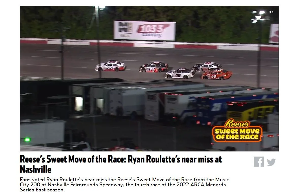 There were a total of 4 possible amazing moves of the race during the Music City 200 at Nashville Fairgrounds Speedway. After the race concluded, and the various race moves were put to the vote, Ryan Roulette has been declared the winner of the Reese’s Sweet Move of the Race! Check out the video below.