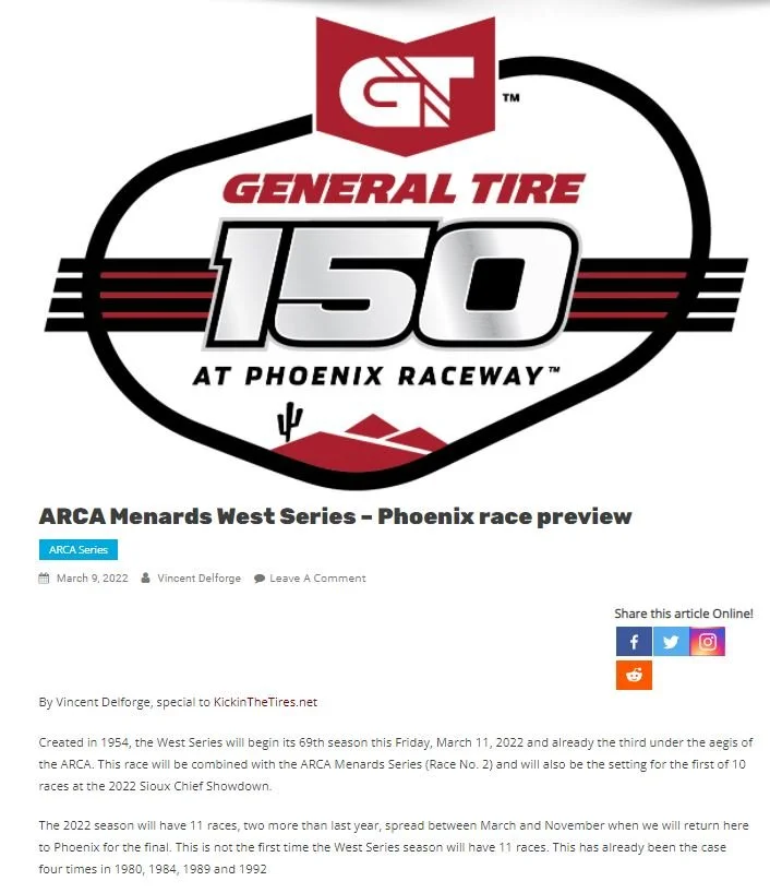 The season continued for the ARCA Menards Series on Friday night at Phoenix Raceway with the running of the General Tire 150, which also served as the opening rounds of the ARCA Menards Series West and Sioux Chief Showdown seasons.